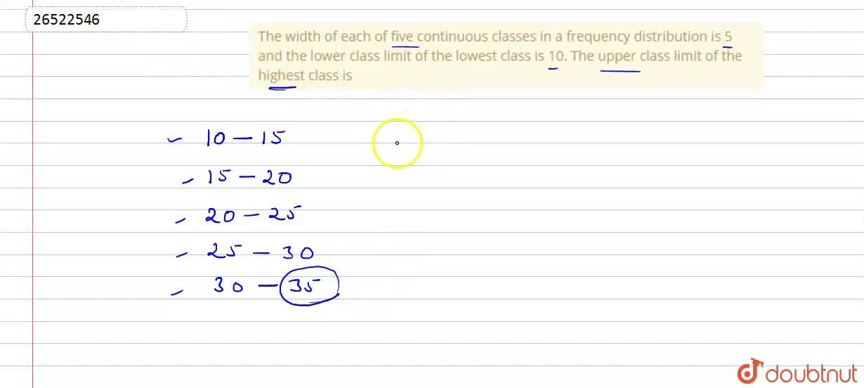 The Width Of Each Of Five Continuous Classes In A Frequency Distribution Is 5 And The Lower Class Limit Of The Lowest Class Is 10 The Upper Class Limit Of The Highest
